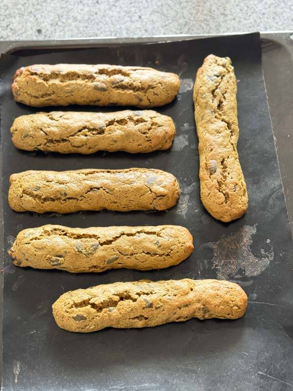 - Nach dem Abkühlen in ca. 1 cm dicke Scheiben schneiden und ein zweites Mal für 15 -20 Minuten bei 150 °C backen.