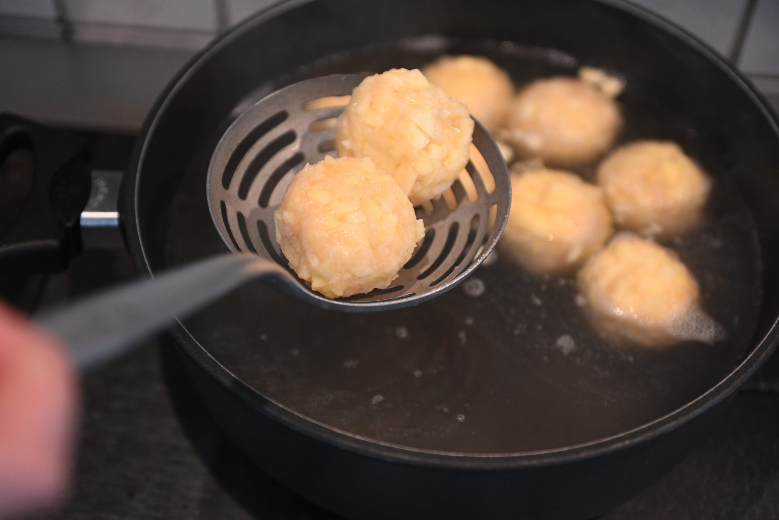 - Wasser in einem Topf zum Kochen bringen, Salz beigeben, Knödel einkochen und 10 Minuten bei leicht kochendem Wasser ziehen lassen.