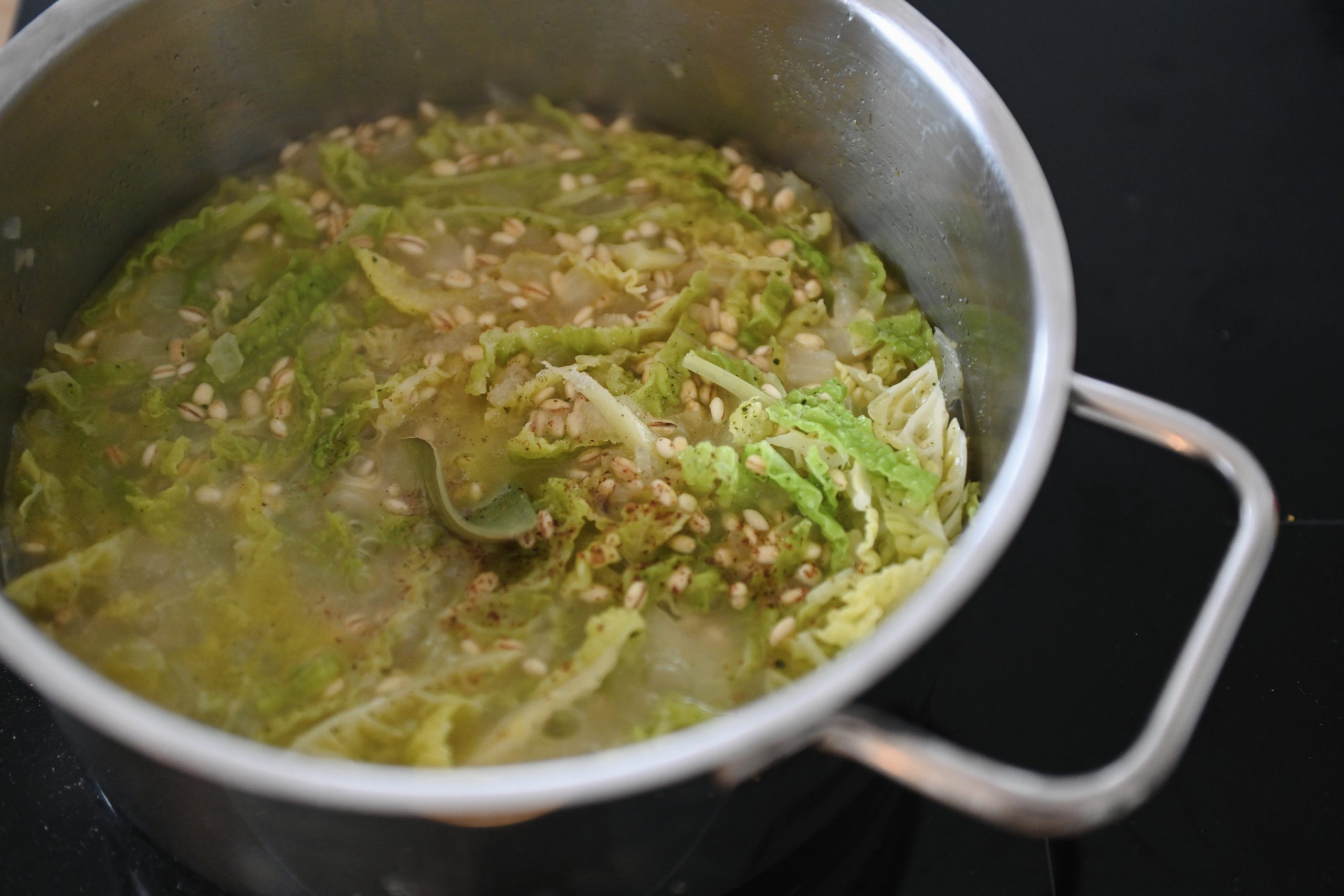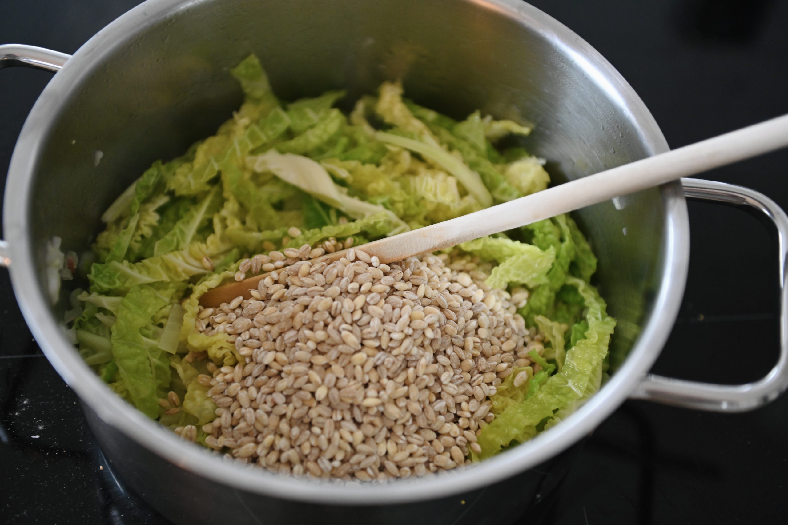 - Kohl klein schneiden und und mit der Rollgerste zum Zwiebel geben. Kurz dünsten, mit Gemüsebrühe ablöschen und köcheln lassen bis die Rollgerste weich ist. Mit Salz, Pfeffer und ev. Muskat würzen.