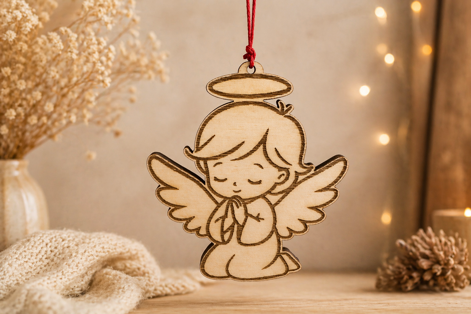 Aus naturbelassenem Holz gefertigt und mit präziser Lasergravur veredelt, entsteht ein besonders harmonisches und warmes Gesamtbild. Die sanfte Darstellung des betenden Engels verleiht jedem Raum eine ruhige, geborgene Atmosphäre.