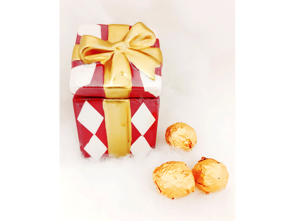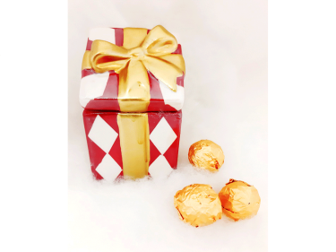gefüllt mit goldenen Frischpralinen und Nougatwürfeln