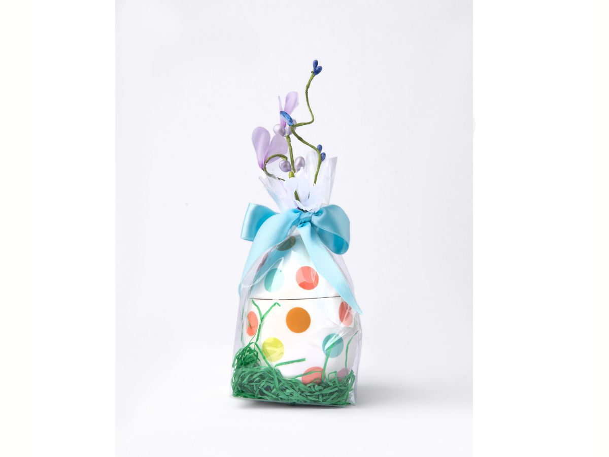 in knitterfreies Cellophan liebevoll verpackt, mit Osterschleife und Blumenornament verziert!