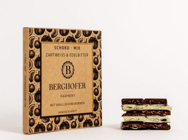 Zwei Sorten Schokolade in einer Tafel - Bitterschoko und weiße Schoko mit Kürbiskernen.