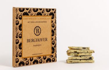 Berghofers handgeschöpfte zartweisse Schokolade mit Vanillekürbiskernen hebt die Laune und macht Freude.