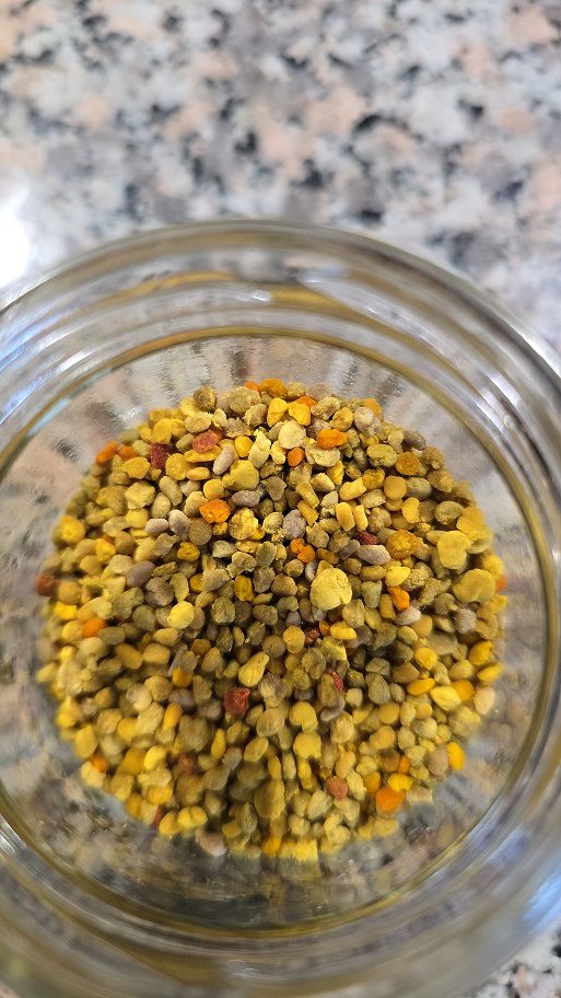 Der Blütenpollen (Blütenstaub der von den Blumen gesammelt wird) wird von den Bienen gehöselt und zum Bienenvolk an den Hinterbeinen klebend nach Hause geflogen. Am Flugloch wird der Blütenpollen von den Hinterbeinen abgestreift und fällt in eine belüftete Holzschale ab. Im nächsten Schritt wird der Blütenpollen gereinigt – schonend getrocknet und in ein Glas abgefüllt.