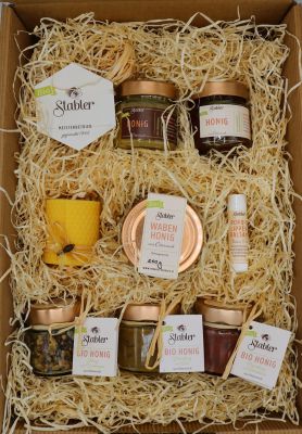 Tauche ein in die Welt des echten Honigs: Dieses liebevoll zusammengestellte Paket vereint Bio Wabenhonig (200 g) – naturbelassen und direkt aus der Wabe – mit feinem Bio Cremehonig (150 g) und aromatischem Bio Waldhonig mit Blütenhoniganteil (150 g). Drei besondere Honigveredelungen (je 125 g) laden zum Entdecken außergewöhnlicher Geschmackskombinationen ein. Ein pflegender Lippenbalsam mit Propolis und eine handgerollte Bienenwachskerze runden das Set ab – für genussvolle, natürliche Wohlfühlmomente.