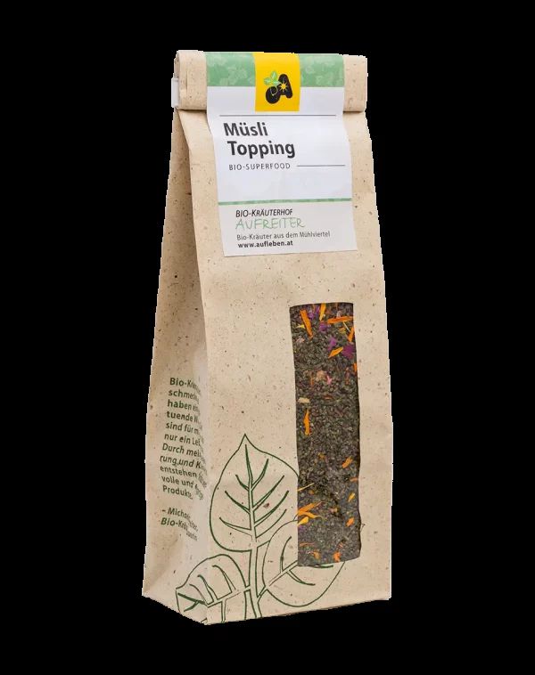 Bio Müsli Topping mit wertvollen Samen & Blüten: Die einzigartige Mischung aus Brennnesselsamen, Spitzwegerich und essbaren Blüten verfeinert dein Frühstück und sorgt für mehr Nährstoffe sowie eine natürliche Unterstützung der Verdauung – 100 % bio, vegan und ohne Zusatzstoffe.