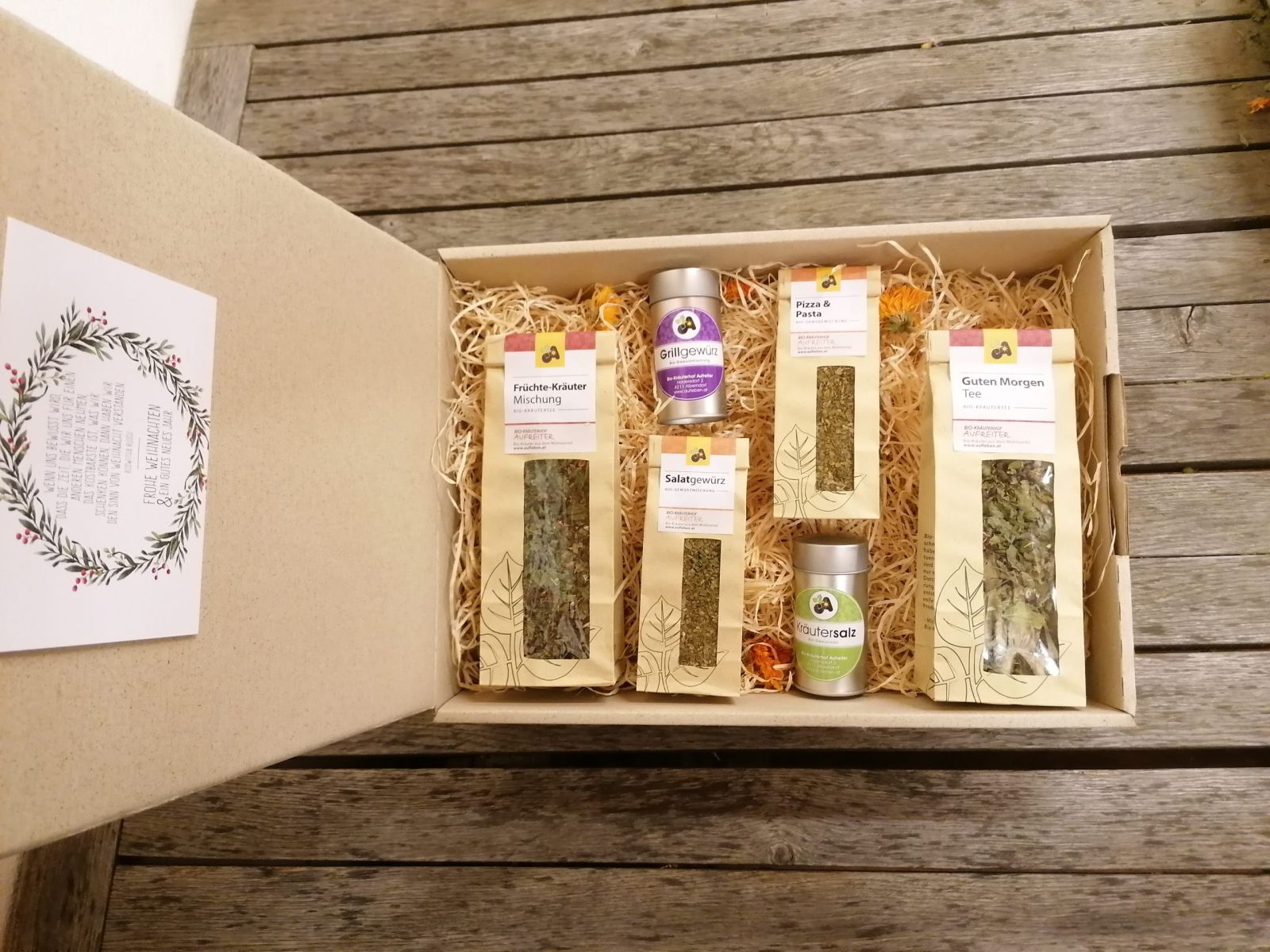 im Graskarton verpackt, 2 Gewürz Streuer, 2 Gewürzmischungen ihrer Wahl, 2 Teemischungen