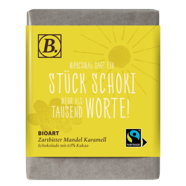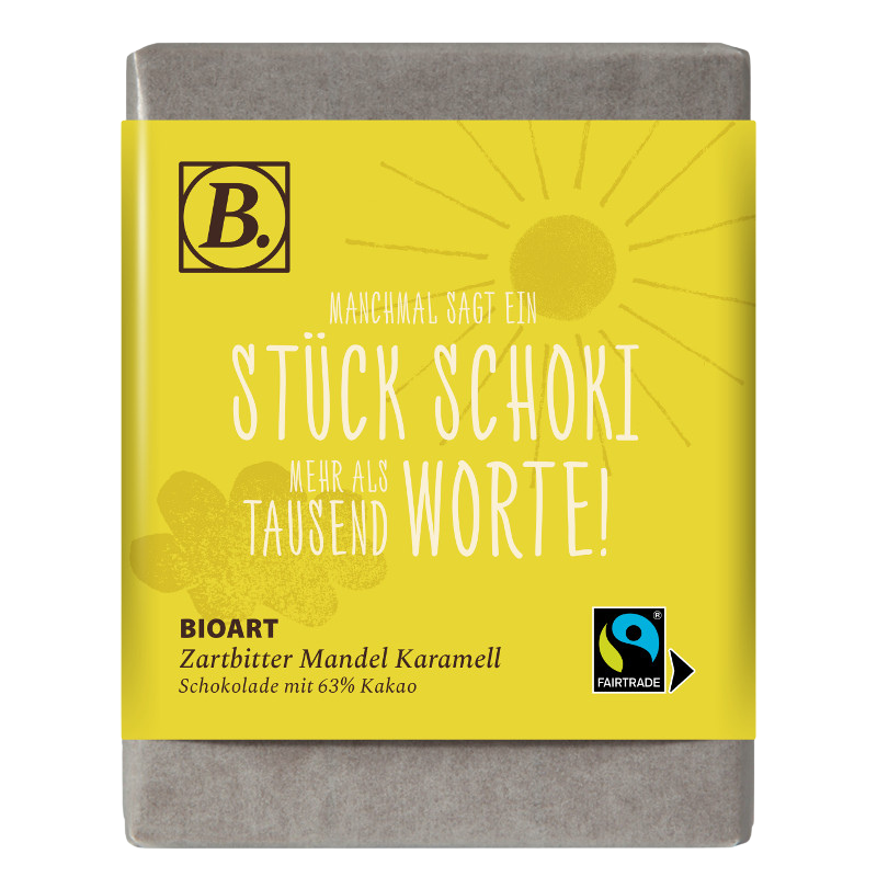 BIOART Schoko “Manchmal sagt ein Stück Schoki mehr als tausend Worte!” 70g Zartbitter Mandel Karamell, Fairtrade