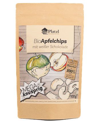 Unsere knackigen Apfelchips überzogen mit zart- schmelzender, weißer Bio-Schokolade. Naschen mit Suchtfaktor. Wertvolle Vitamine und Mineralstoffe der Äpfelchips werden durch schonende Trocknung erhalten.