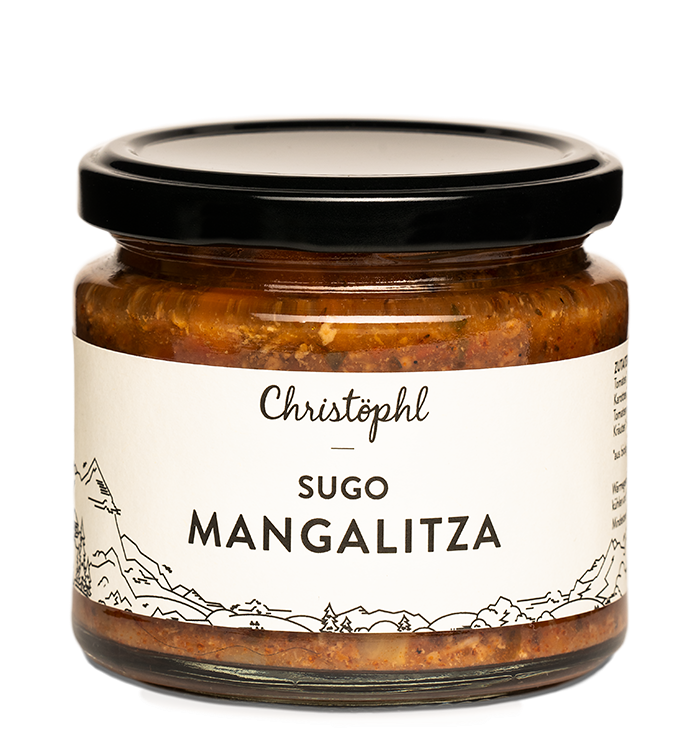 Mangalitzafleisch* 20%, Tomaten*, Rindfleisch* 10%, Zwiebeln*, Karotten*, Sellerie*, Rotwein*, Knoblauch*, Tomatenmark*, Maisstärke*, Salz, Olivenöl*, Kräuter*, Gewürze*