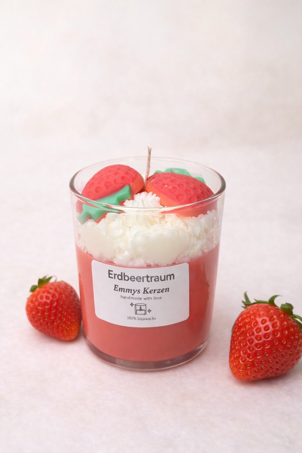 Tauche ein in einen süßen Wohlfühlmoment mit dieser handgemachten Duftkerze „Erdbeertraum“. Der fruchtige Erdbeerduft erinnert an sonnige Sommertage, frische Erdbeeren und pure Leichtigkeit. Perfekt, um dein Zuhause in eine gemütliche, warme Atmosphäre zu verwandeln.