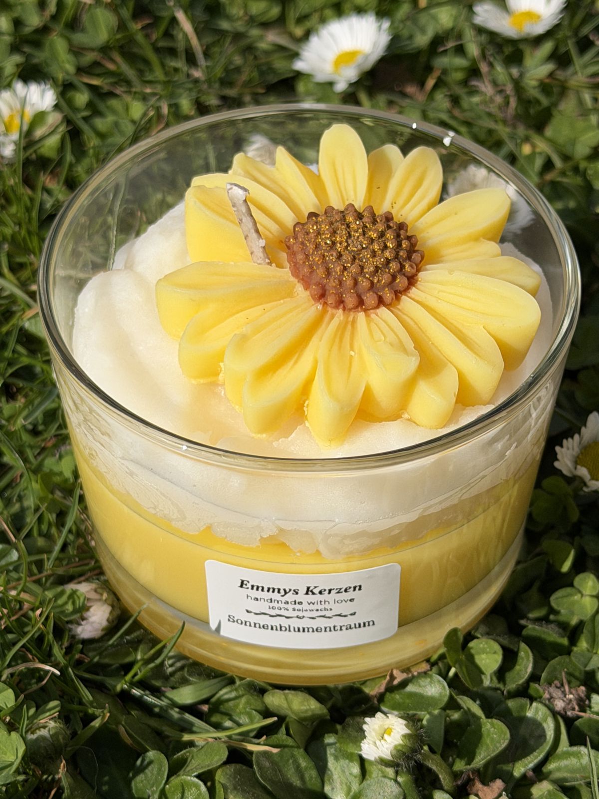 Die Sonnenblumentraum – Kerze mit sommerlichem Design von Emmys Kerzen ist eine besondere handgemachte Kerze aus hochwertigem Sojawachs.