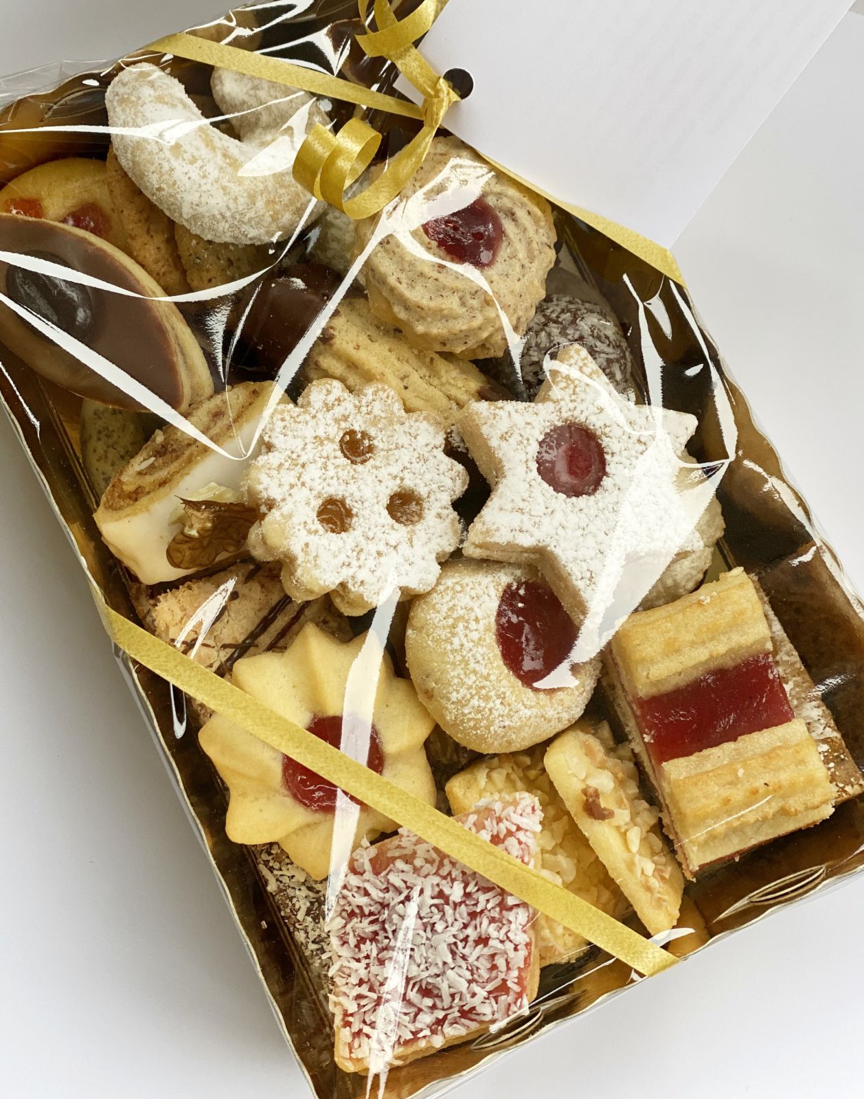 Weizenmehl, Ei, Butter, Zucker, Walnüsse, Haselnüsse, Kürbiskerne, Kokosflocken, Marillen-Fruchtaufstrich (Marillen, Zucker, Geliermittel: Pektin, Säuerungsmittel: Zitronensäure, Konservierungsmittel: Kaliumsorbat), Ribisel-Fruchtaufstrich (Ribisel, Zucker, Geliermittel: Pektin, Säuerungsmittel: Zitronensäure, Konservierungsmittel: Kaliumsorbat), Schokolade (Zucker, gehärtetes pflanzliches Fett, fettarmer Kakao, Emulgator: Sojalecithine, Aroma: Vanillin), Rum, Nuss-Creme (Zucker, Palmöl, Haselnüsse, fettarmer Kakao, Magermilchpulver, Süssmolkenpulver, Emulgator: Sojalecithine)