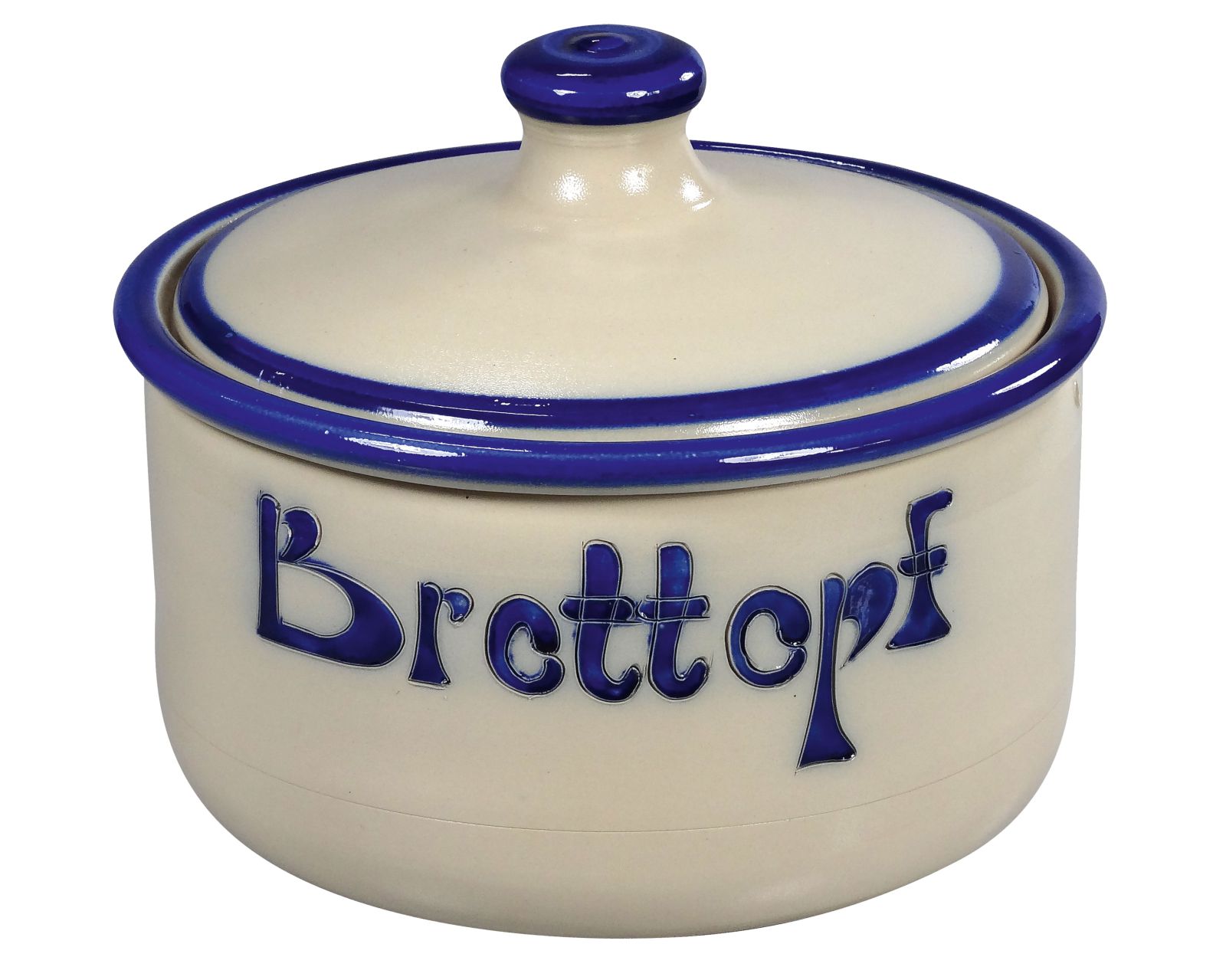 Der schlichte Brottopf; die Grundfarbe dabei ist Ton naturfarben, Rand und Schrift in den Naturfarben. Es kommen nur reine Erdfarben zum Einsatz.
