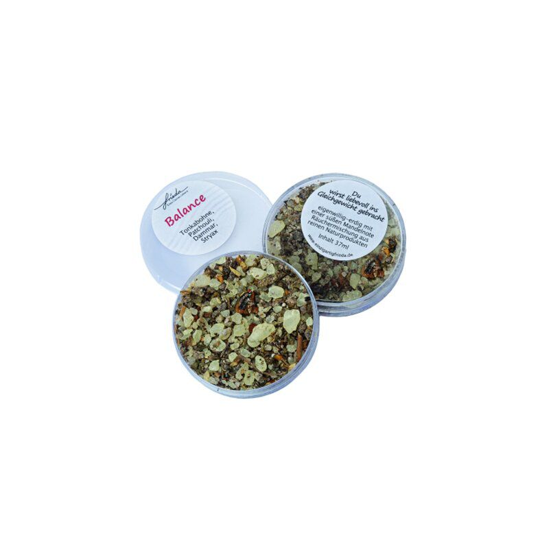 Ausgleichende Räuchermischung „Balance“ mit Tonkabohnen, Styrax, Patschuli und Dammar. Eigenwillig-erdiger Duft mit süßer Mandelnote für innere Harmonie und Stabilität.