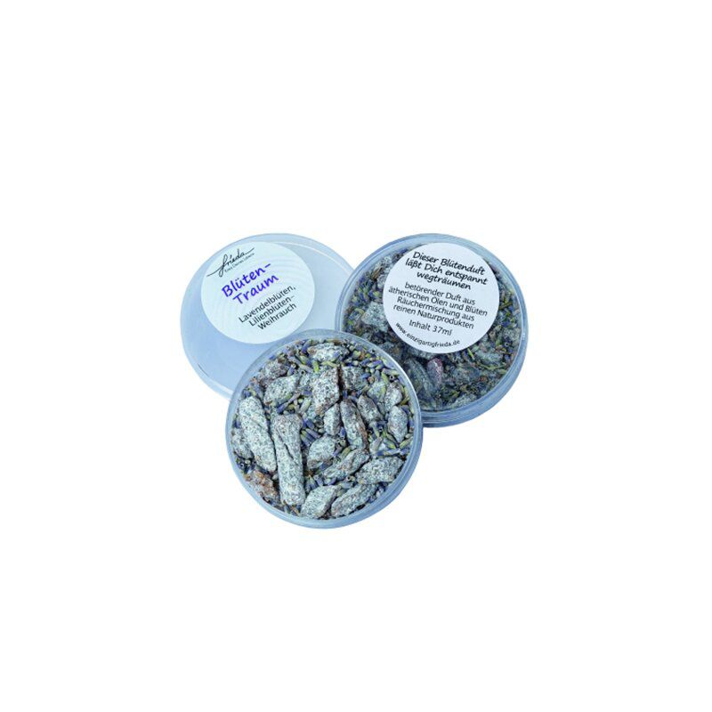 Sanfte Räuchermischung „Blütentraum“ mit Lavendelblüten und Lilienblütenweihrauch. Betörender Duft aus ätherischen Ölen und Blüten – ideal zum Entspannen und Wegträumen.