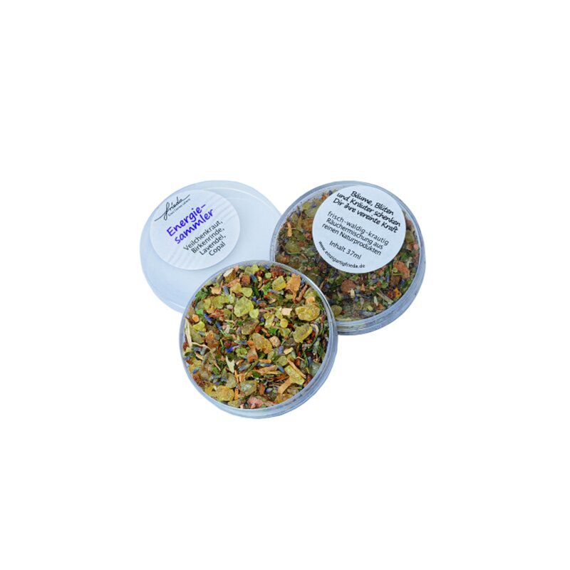 Belebende Räuchermischung „Energiesammler“ mit Birkenrinde, Veilchenkraut, Lavendel und Copal. Frisch-waldig-krautiger Duft zur Aktivierung und Bündelung neuer Energie.