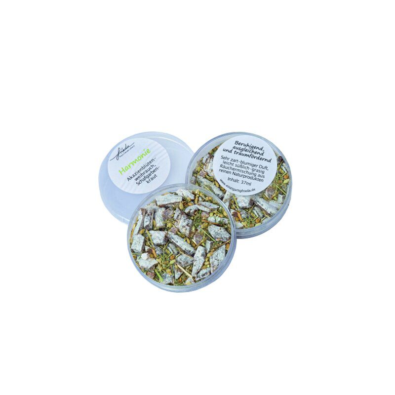 Sanfte Räuchermischung „Harmonie“ mit Akazienblütenweihrauch und Schafgarbenkraut. Sehr zart-blumiger, leicht süßlich-grasiger Duft – beruhigend, ausgleichend und traumfördernd.