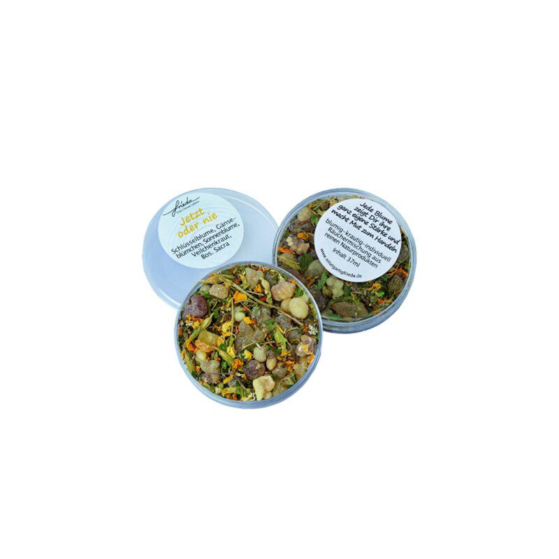 Inspirierende Räuchermischung „Jetzt oder nie“ mit Schlüsselblume, Gänseblume, Sonnenblume, Veilchenkraut und Boswellia Sacra. Blumig-krautig-individueller Duft, der Mut zum Handeln schenkt.