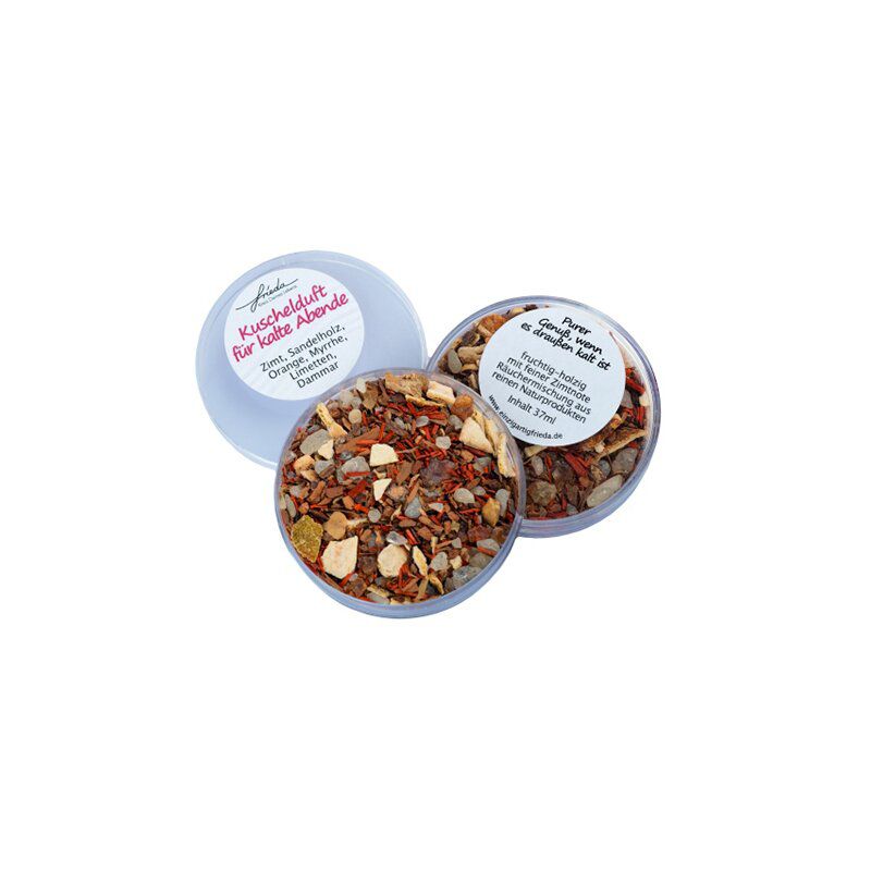 Wohlig-warme Räuchermischung „Kuschelduft für kalte Abende“ mit Zimt, Sandelholz, Orange, Myrrhe, Limette und Dammar. Fruchtig-holziger Duft mit feiner Zimt Note – purer Genuss an kalten Tagen.