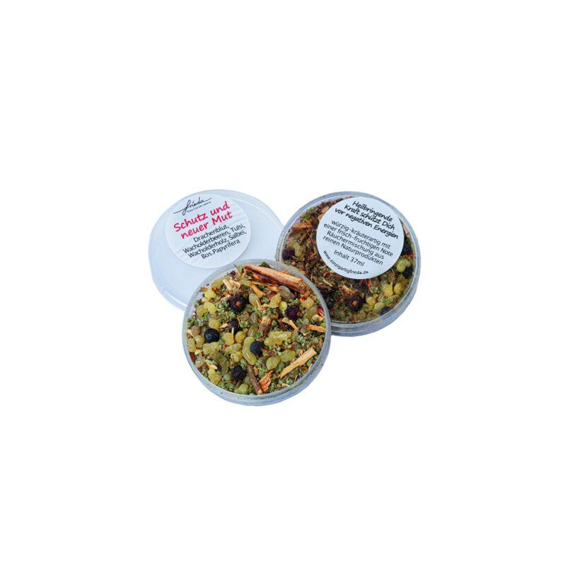Stärkende Räuchermischung „Schutz und neuer Mut“ mit Drachenblut, Wacholder, Tulsi, Salbei und Boswellia Papyrifera. Würzig-kräuterartiger Duft mit frisch-fruchtiger Note für Schutz und Zuversicht.