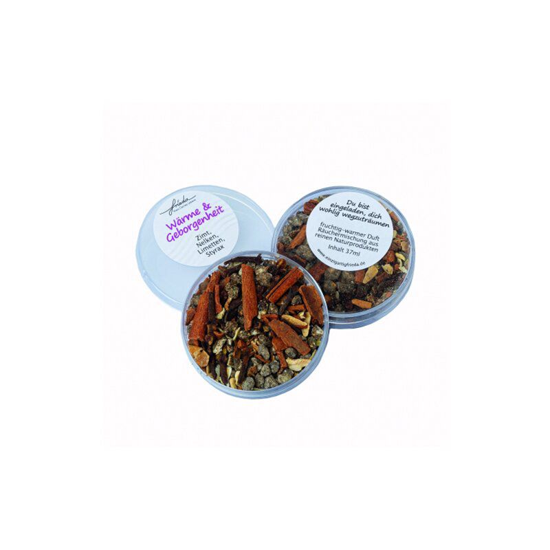 Wohltuende Räuchermischung „Wärme & Geborgenheit“ mit Zimt, Nelken, Limette und Styrax. Fruchtig-warmer Gewürzduft, der zum Entspannen und Wegträumen einlädt.