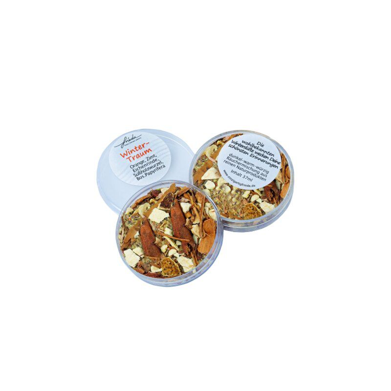 Stimmungsvolle Räuchermischung „Wintertraum“ mit Orange, Zimt, Süßholzwurzel und Boswellia Papyrifera. Dunkel-warm-würziger Duft, der winterliche Erinnerungen weckt.