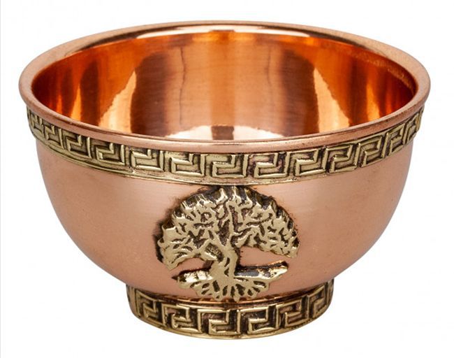 Kompakte Räucherschale aus Kupfer mit Baummotiv. Ideal für traditionelles Räuchern mit Kohle und Räuchersand. Ø 8 cm, Höhe 4,5 cm