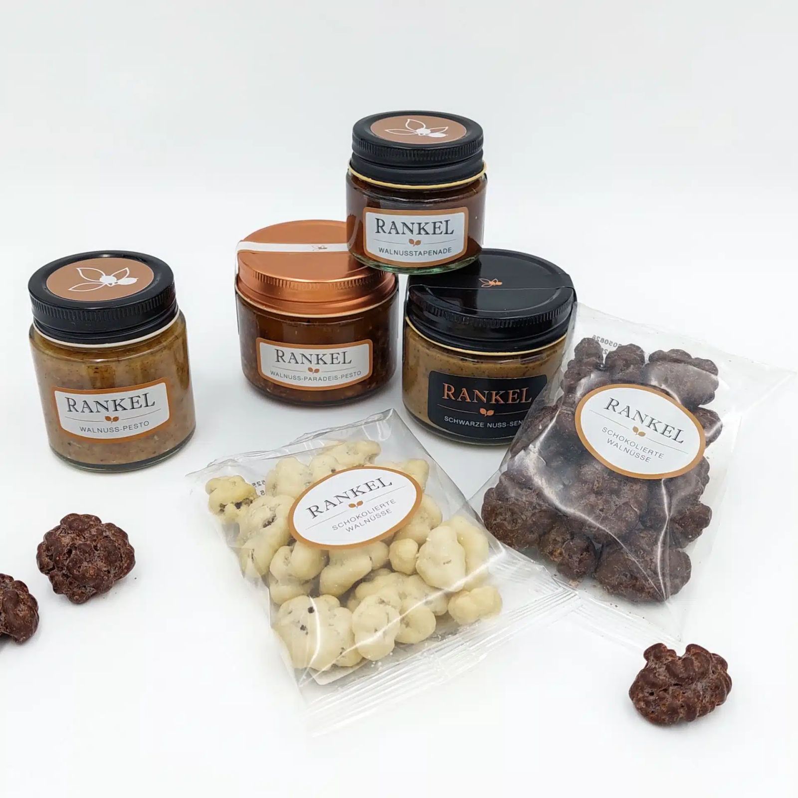 Walnuss-Pesto, Walnuss-Paradeis-Pesto, Walnuss-Tapenade, Schwarze-Nuss-Senf, schokolierte Walnüsse (Vollmilch) & schokolierte Walnüsse (weiße Schokolade)