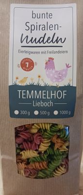 Bunte Nudeln 4er: Hartweizengrieß, 26% Freilandeier, 7,5% Spinat, 6% Tomaten, 1,5% Paprika