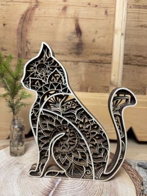 Filigrane Katzenfigur aus mehreren Schichten naturbelassenem Holz, präzise per Laserschnitt gefertigt. Die aufwendig gearbeiteten Muster und geometrischen Formen verleihen der Silhouette Tiefe und einen besonderen 3D-Effekt.