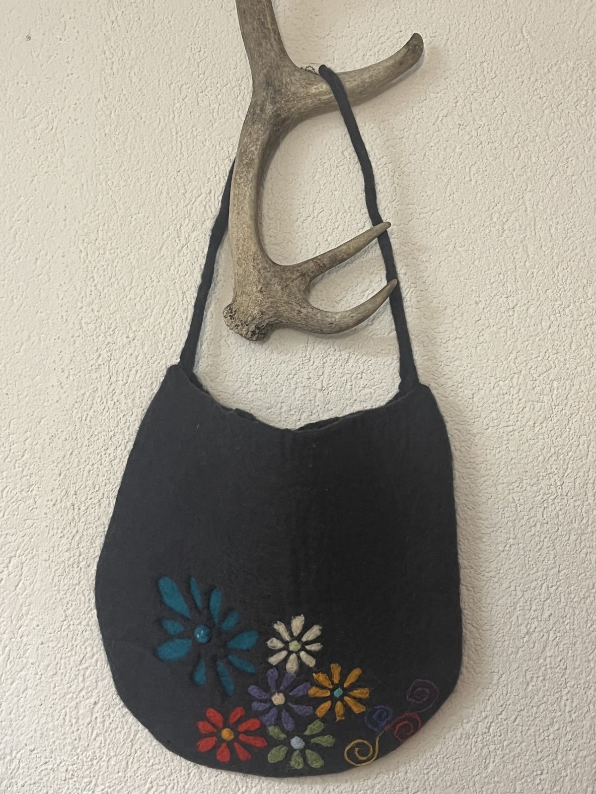 Die Tasche ist ein Einzelstück und wird von Hand mit farbigen Filzblumen verziert – jedes Motiv entsteht frei beim Arbeiten und macht jede Tasche einzigartig.