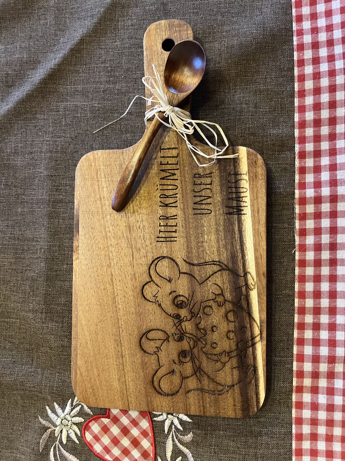 Holzbrett „Unsere kleine Krümelmaus“ – liebevoll graviert, inkl. Holzlöffel