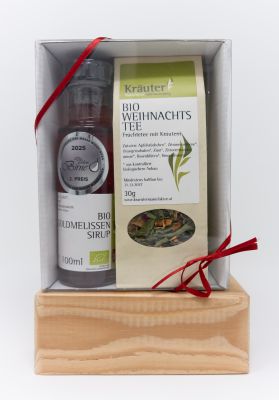 Diese feine Geschenkbox besteht aus unserem Goldmelissensirup sowie einem fruchtigen Weihnachtstee.