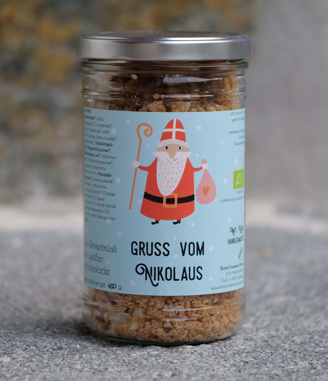 Bio-Dinkelmüsli mit weißer Schokolade- Nikolaus