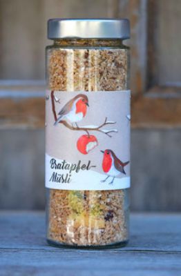 Zutaten: Dinkelflocken (68%), Apfeldicksaft, Rosinen, Sonnenblumenöl, Leinsamen, Apfelstücke getrocknet (1,4%), Cornflakes, Gewürze. Alle Zutaten aus kontrolliert biologischem Anbau.