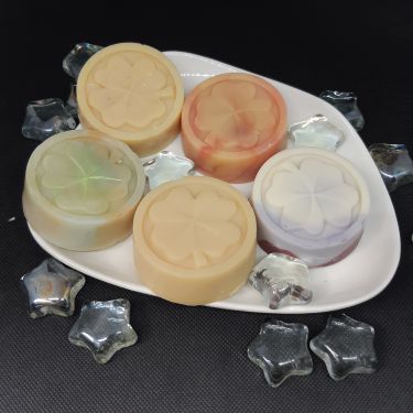 Gästegeschenk oder Mitbringsel zu Silvester: elegante runde Naturseife mit vierblättrigem Kleeblattmuster.