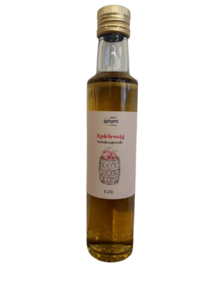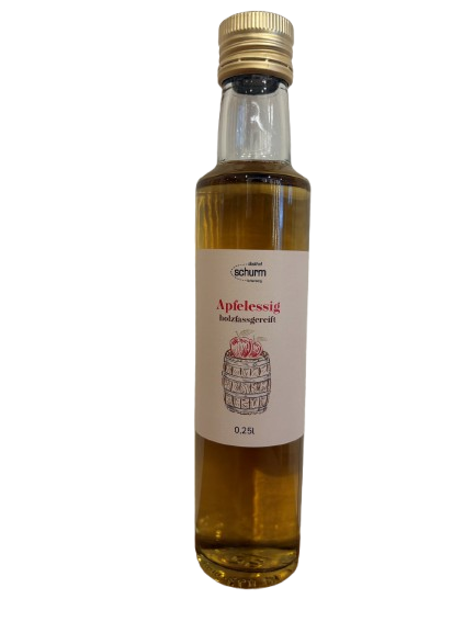 Die ausschließlich von Hand geernteten Früchte werden sauber und schonend zu Saft verarbeitet, bevor sie unter kontrollierter Temperatur zügig zu Obstwein vergoren werden. Im nächsten Schritt wird die Essiggärung eingeleitet die den hervorragenden Wein zu einem würzigen Essig werden lässt. Anschließend wird der Apfelessig 2 Jahre im Eichenfass gelagert um seinen runden Geschmack mit den köstlichen Vanillenoten zu bekommen.
