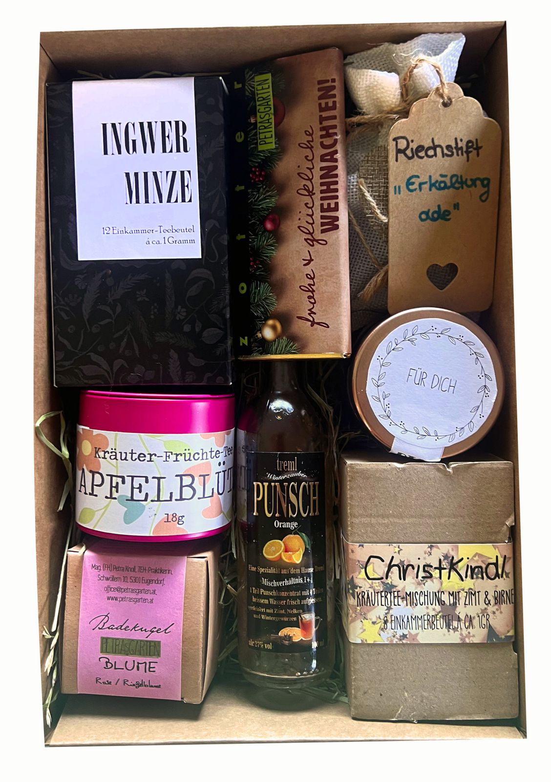 Der braune, natürliche Geschenkkarton ist befüllt mit einer Packung Christkindl Kräutertee, einer Packung Ingwertee und einer Dosen mit offenem Früchtetee in der Sorte Apfelblüte. Das vierte Produkt aus PetrasGarten ist eine Badekugel. Dazu gesellen sich eine Tafel Bio Weihnachtsschokolade vom Zotter und eine 100 ml Treml Punsch Flasche. Abgerundet wird die regionale Besonderheit mit einem Glas Bio Honig aus Weltenberg und einem Riechstift, der die Nase bei Schnupfen befreit. Als Füllmaterial dient Heu oder Stroh.