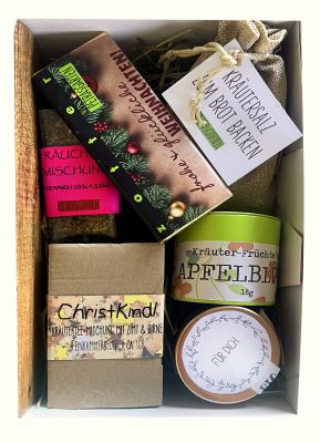 Der Karton im Holzoptikstil überrascht mit vielen besonderen Köstlichkeiten, die nicht alltäglich sind. Bio Honig aus Weltenberg, Tees aus Eugendorf oder auch Schokolade vom Zotter werden dem oder der Beschenkten ein erfreutes Lächeln ins Gesicht zaubern.