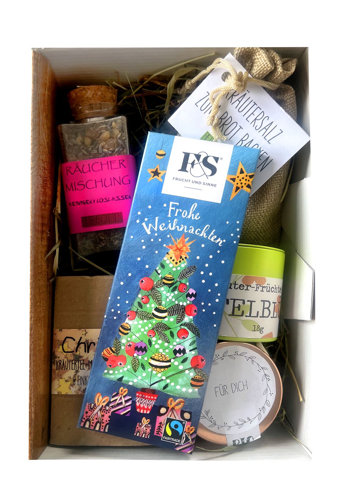 Der Karton im Holzoptikstil überrascht mit vielen besonderen Köstlichkeiten, die nicht alltäglich sind. Bio Honig aus Weltenberg, Tees aus Eugendorf oder auch Schokolade aus Frankenmarkt werden dem oder der Beschenkten ein erfreutes Lächeln ins Gesicht zaubern.