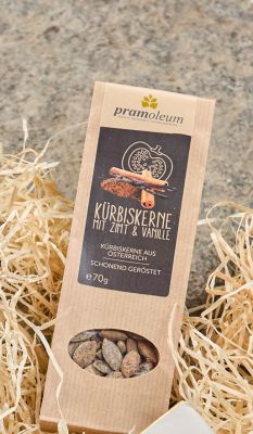 Empfehlung: Vanilleeis mit Kürbiskernöl, Schlagobers, mit Knabberkerne Zimt-Vanille garnieren!