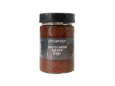 Saftige Zwetschken und fruchtige Birnen werden mit etwas karamellisiertem Rohrzucker und diversen „geistigen“ Zutaten zu diesem wunderbar aromatischen Röster eingekocht.