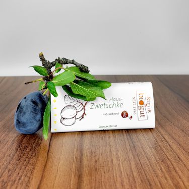 Nobelbitterschokolade gefüllt mit Zwetschkenbrandcreme - alkoholhaltig.