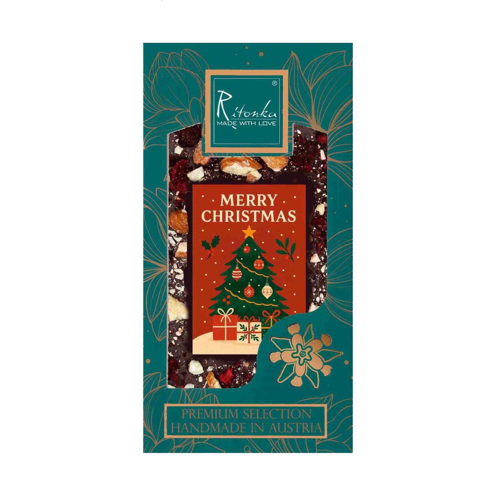 *Premium Bitterschokolade mit Weihnachtsbaum und gefriergetrockneten Kirschen und Mandel