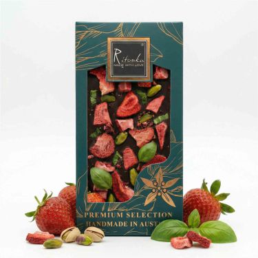 Entdecken Sie die exquisite Ritonka Premium Milchschokolade mit einem raffinierten Mix aus fruchtiger Erdbeere, delikaten Pistazien und aromatischem Basilikum. Diese einzigartige Kombination vereint hochwertige Milchschokolade mit erlesenen Toppings zu einem unvergleichlichen Geschmackserlebnis. Jede köstliche Praline bietet eine harmonische Fusion von süßen, nussigen und frischen Nuancen, die Ihre Sinne verzaubern werden. Genießen Sie die perfekte Balance zwischen Schokolade und den feinen Toppings in jeder köstlichen Bissgröße dieser 95g Packung. Verwöhnen Sie sich mit dieser edlen Schokolade oder überraschen Sie Ihre Liebsten mit einem Geschenk, das Freude und Genuss vereint. Erleben Sie mit Ritonka Premium Milchschokolade einen geschmacklichen Höhepunkt, der jedem Gaumen schmeichelt.
