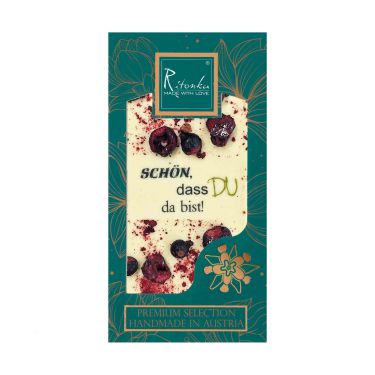 Ein zarter Gruß, der von Herzen kommt: Unsere handgefertigte Premium-Schokolade „Schön, dass du da bist“ vereint feine weiße Schokolade mit fruchtigen Highlights aus gefriergetrockneten schwarzen Johannisbeeren und süß-säuerlichen Kirschen.