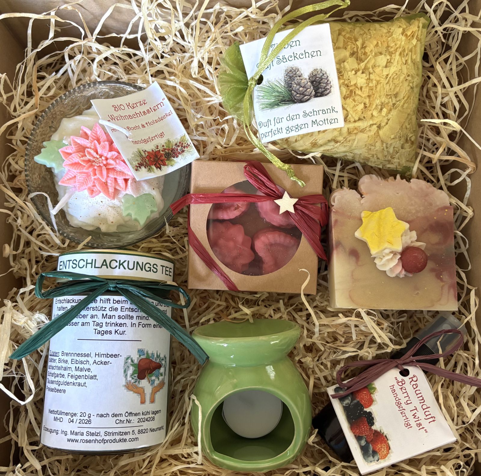 1 Kerze in Schale mit 30 Stunden Dufterlebnis, 1 kleine Duftlampe mit 4 Duftwachs in Box, 1 Raumspray, 1 Seife 100 g, 1 Zirben Schranksäckchen und einen Tee für gemütliche Stunden.