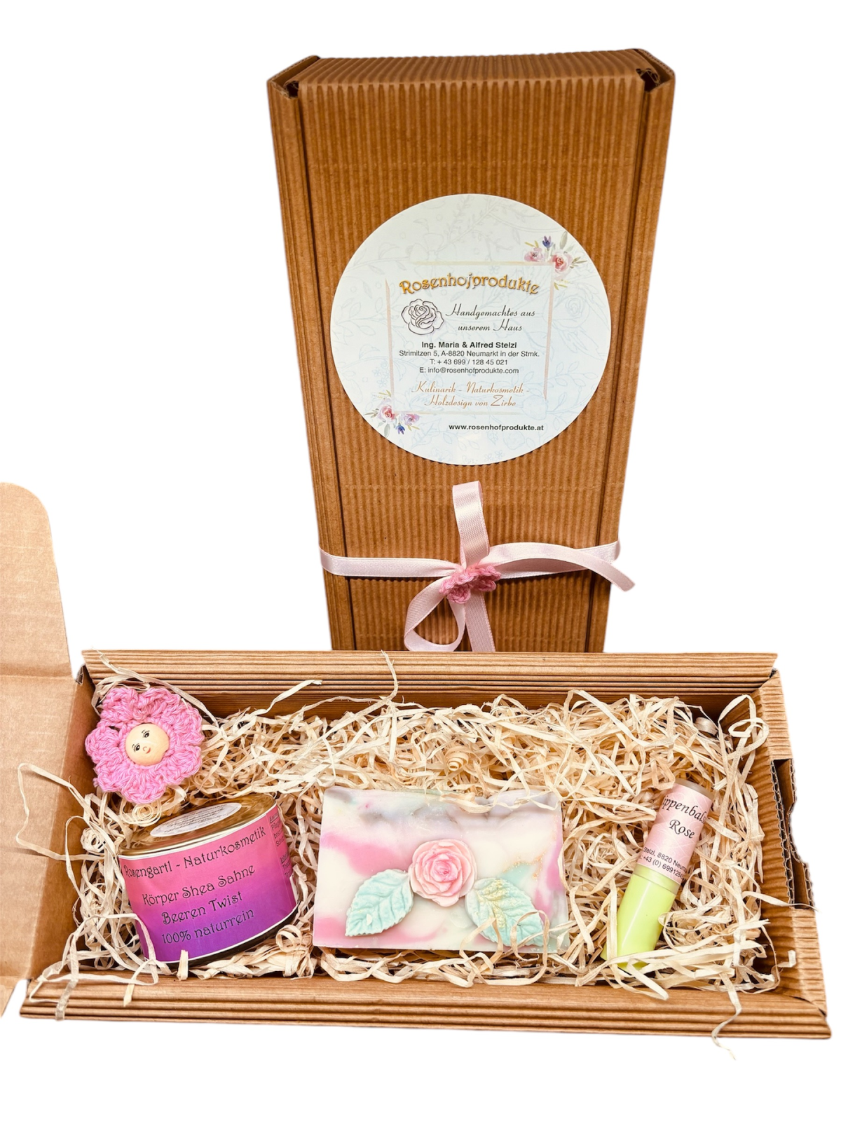 lerne unsere Naturkosmetik kennen. Hier in Form von einer Körper Shea Sahne "Berry Twist", kaltgerührte Seife "Rose", Lippenbalsam "Rose". Wir arbeiten ausschließlich mit Ölen in bio Qualität.